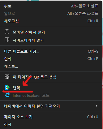 빈 공간에 마우스 오른쪽 클릭하여 누르시면 작은 창이 생기며 한국어(으)로 눌러주시면 번역이 가능합니다.