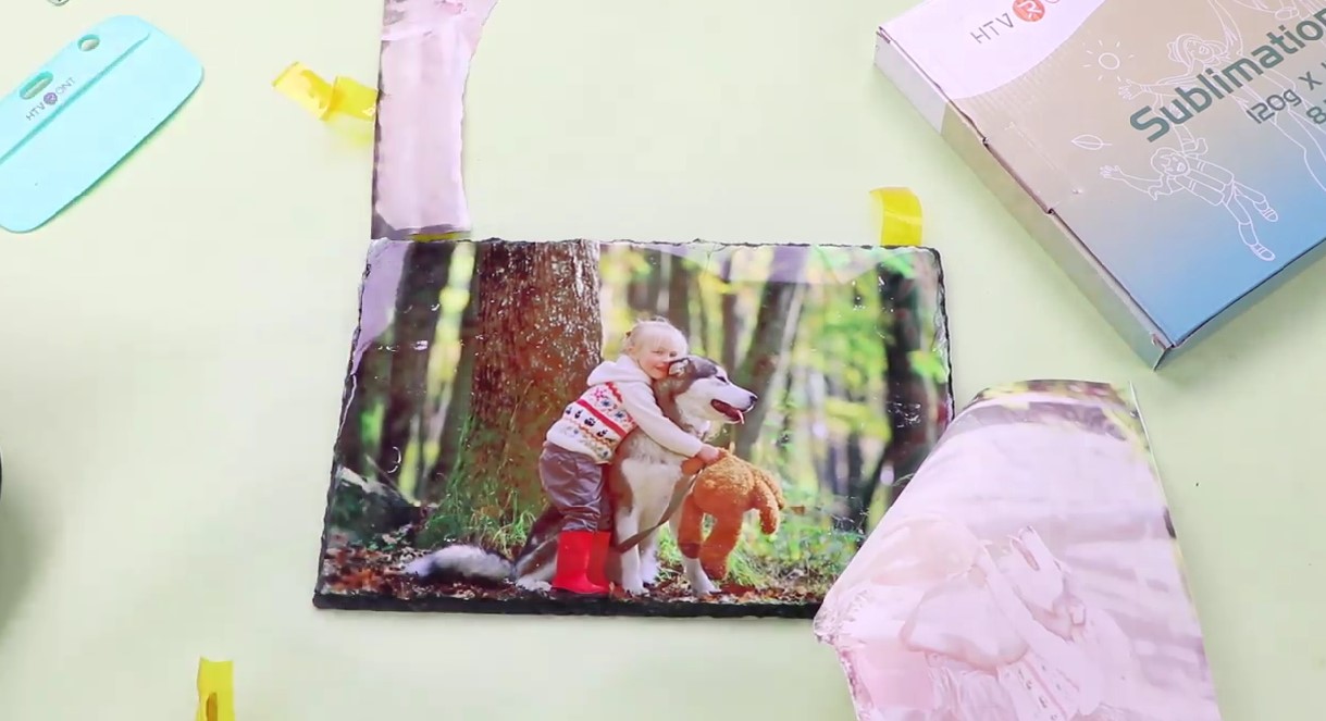 2. 인쇄된 이미지가 액자를 향하도록 배치한 후 강한 테이프로 고정시킨 다음 열프레스로 열 전사