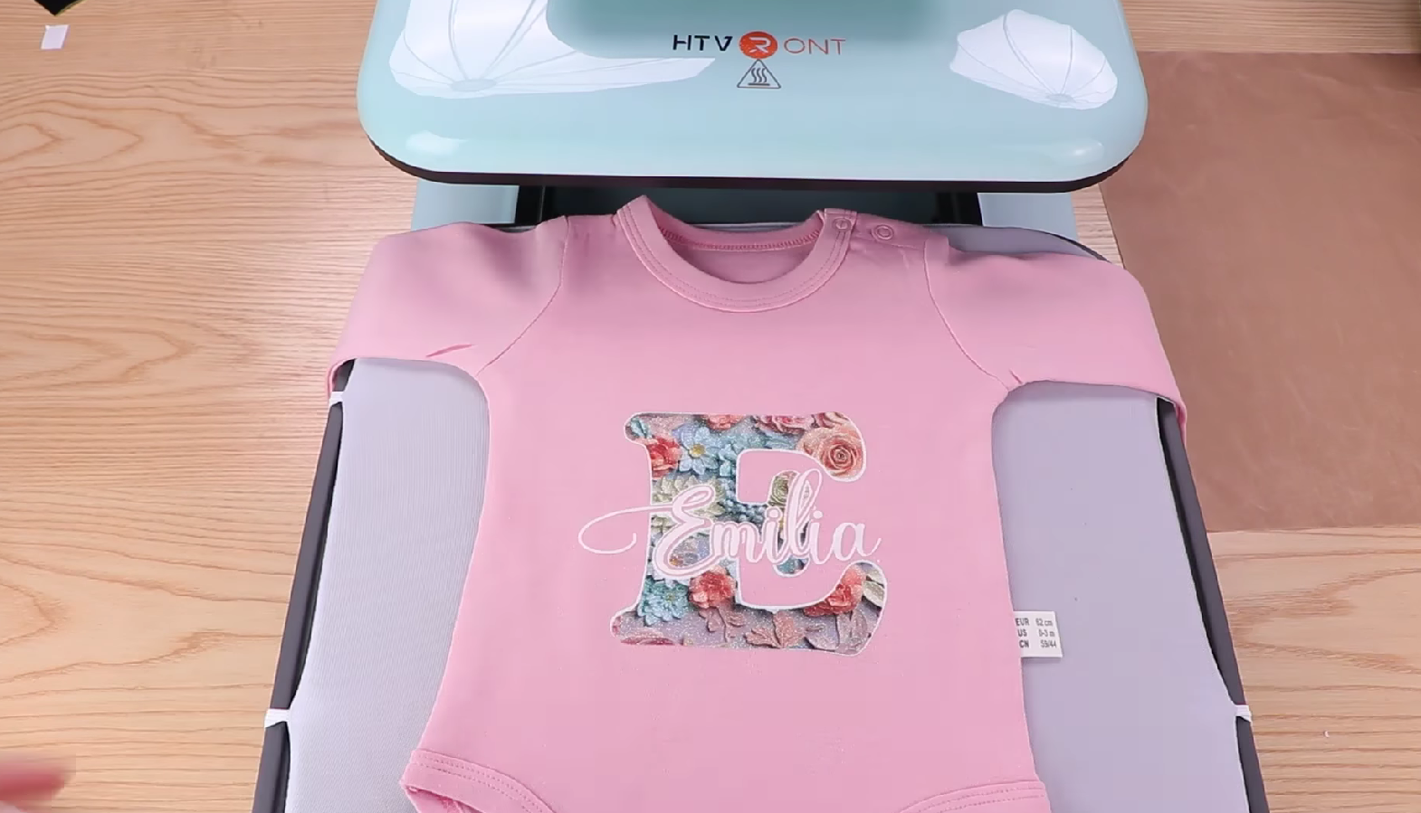 4. 인쇄한 승화용지를 티셔츠 위에 배치 후, 천이나 다림질 시트를 올리고 자동 열프레스로 열 전사 5. 용지를 떼어내면 아기자기한 아기 티셔츠 완성!