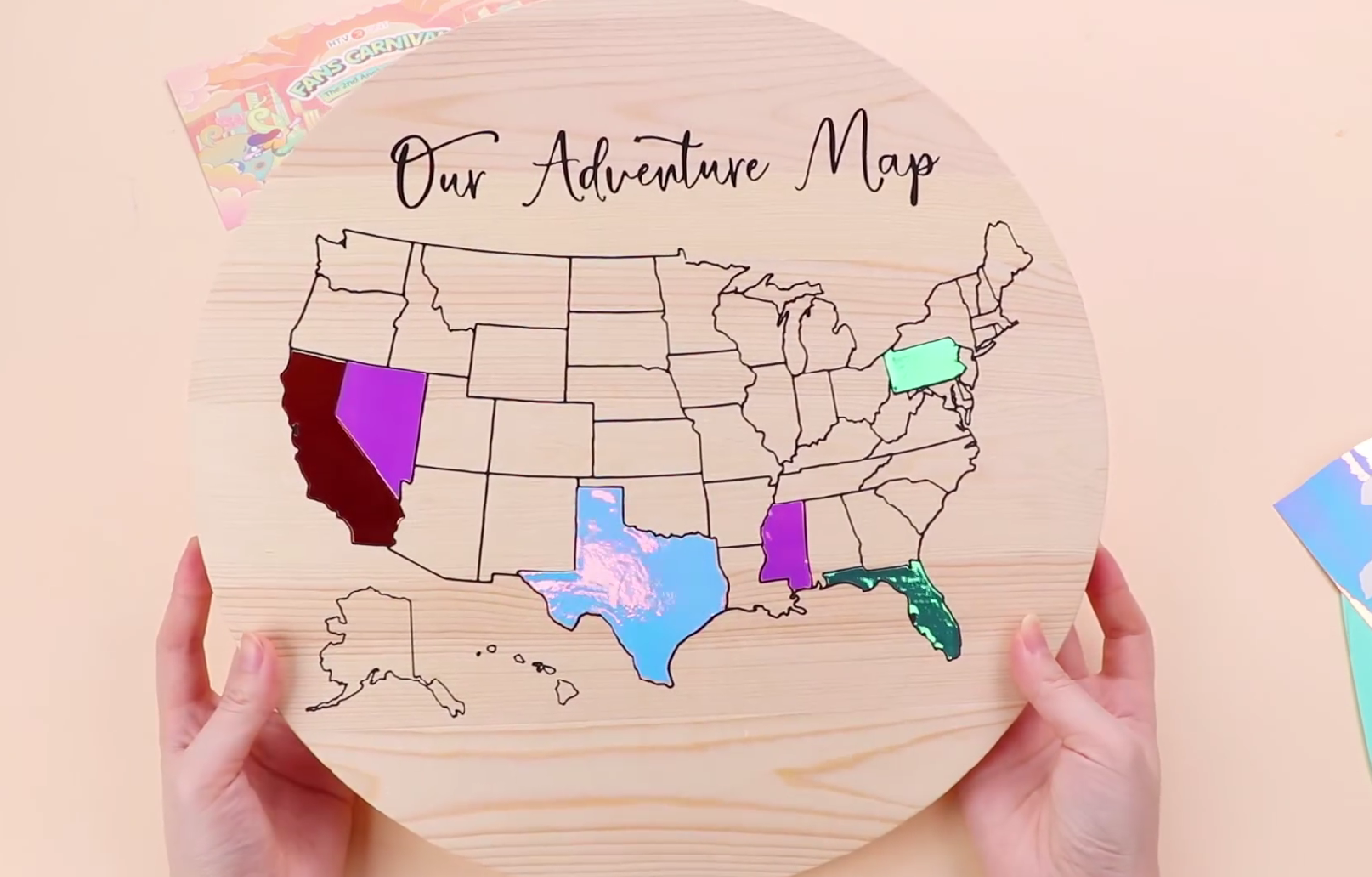 아이들과 함께 나무 원목 원판에 시트지를 붙여 지도를 꾸며보세요.