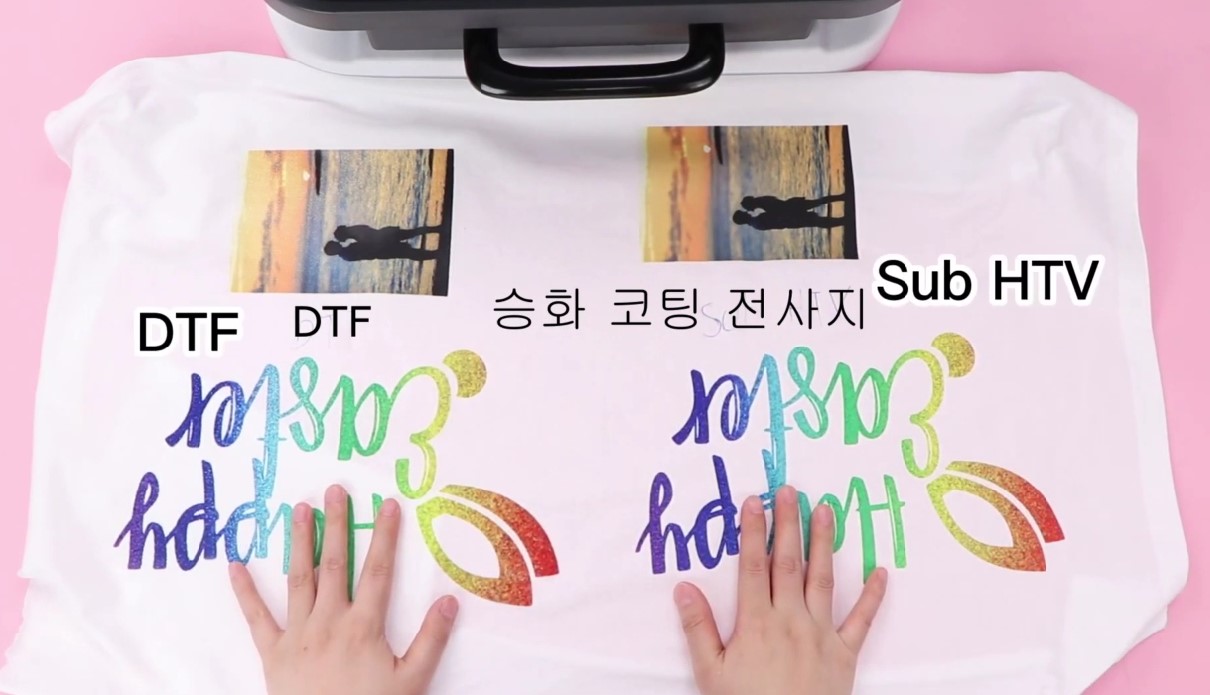 승화 코팅용 열 전사지와 DTF 비교 영상입니다.