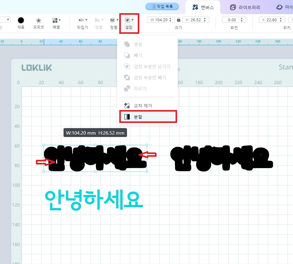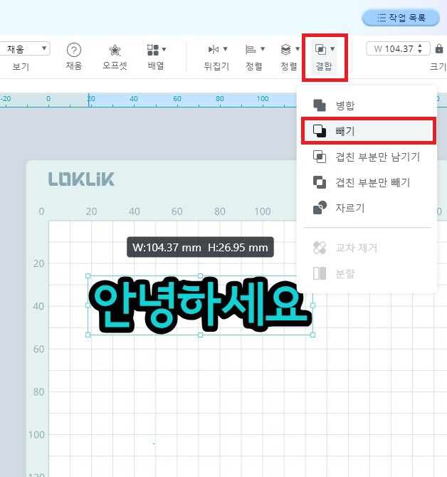 9) “안녕하세요” 글자를 전체 클릭 후, 위 상단 바에서 결합을 클릭 후, 병합을 클릭하면 분리 되었던 자음, 모음이 하나로 병합이 되며, 양각 글자가 완성 됩니다. 이대로 커팅을 진행합니다.