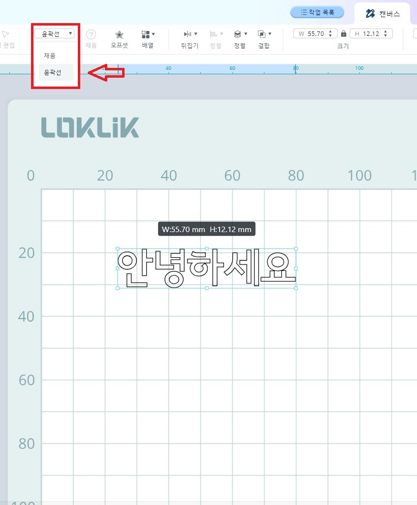 4) 상단 바의 윤곽선을 클릭하여 글자의 윤곽선만 보일 수 있으며, 채움을 누르면 글자에 색상이 채워집니다.