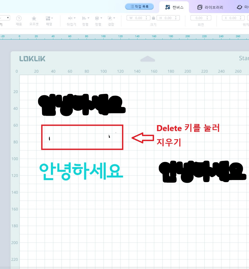 6) 오프셋이 적용된 “안녕하세요” 글자를 클릭하여 위 또는 옆으로 드래그하여 나온 불필요한 부분을 지웁니다.