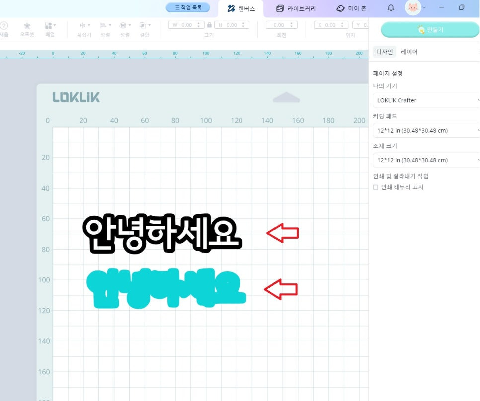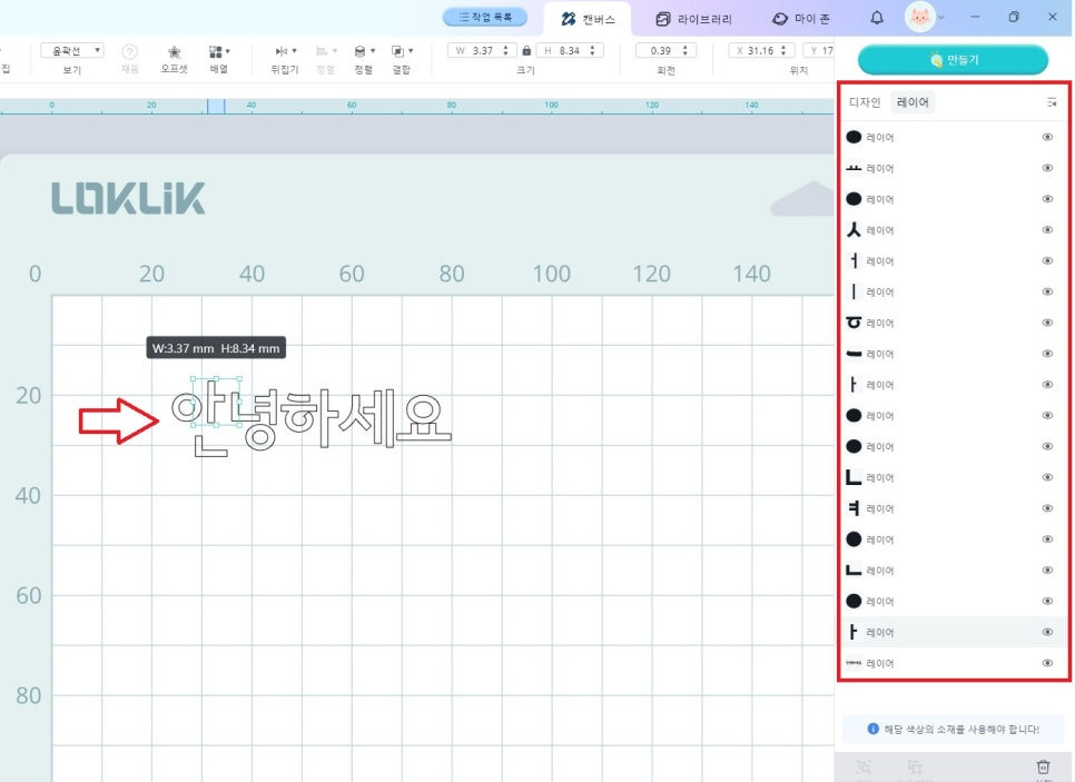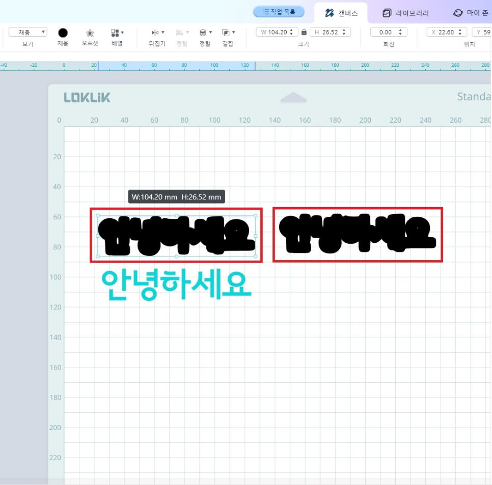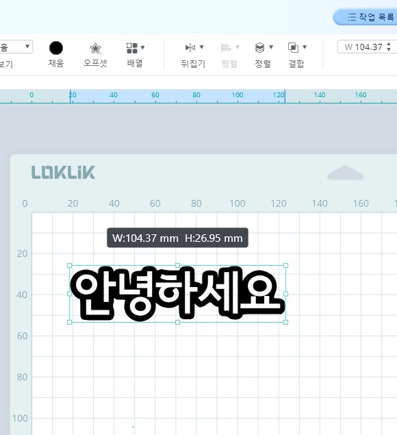 7) “안녕하세요” 글자 전체를 선택한 후, 상단 바의 채움을 클릭하면 색상이 채워집니다. 이응 부분이 검게되어 커팅 할 공간이 보이지 않게 됩니다.