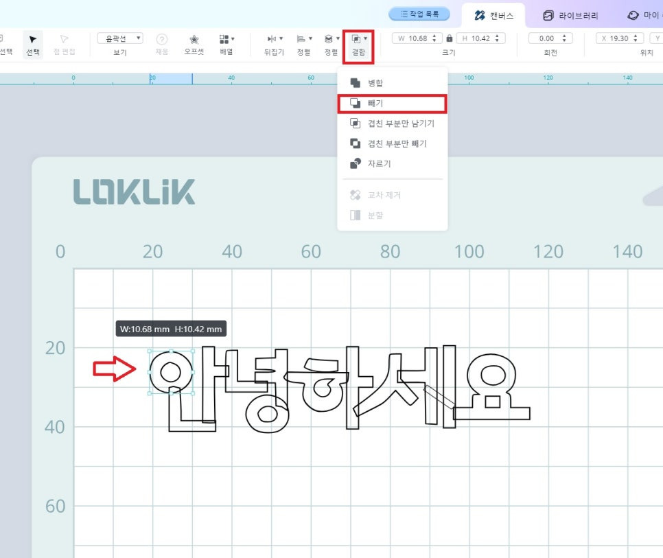 8) 단어 “안”의 이응 부분에서 동그라미가 이중으로 병합이 되었으므로, 상단의 결합을 클릭하여, 빼기를 클릭하여 두개의 동그라미를 분리시켜 커팅할 공간이 나옵니다.