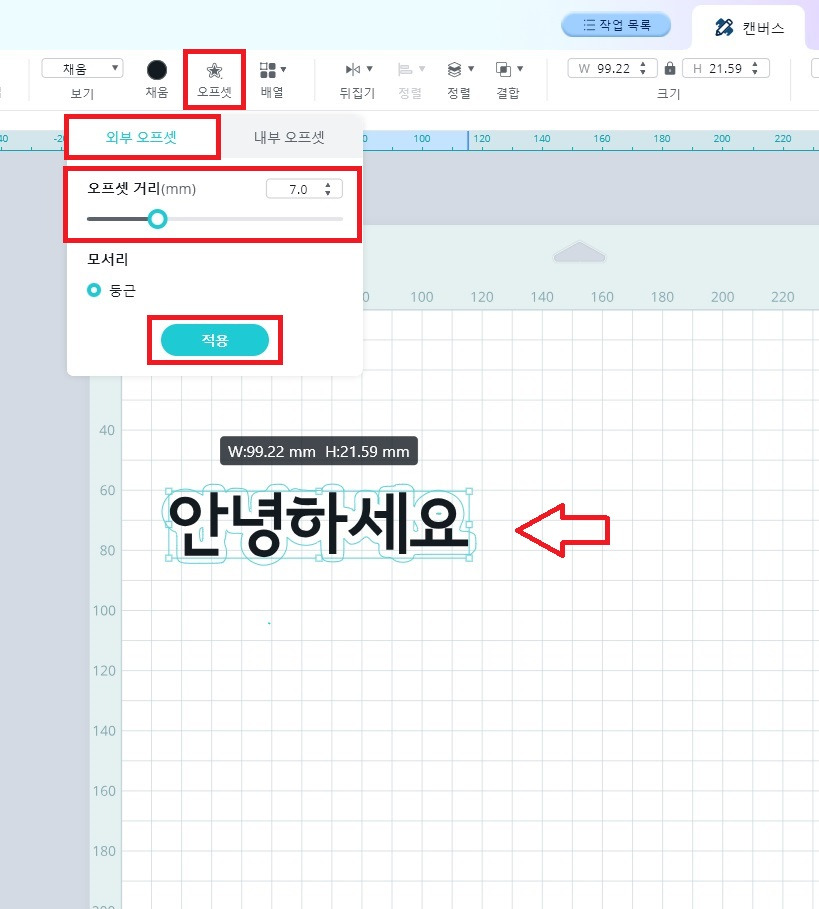 2) 오프셋을 클릭 후, 외부 오프셋에서 오프셋 거리를 조절 후 적용을 누릅니다.