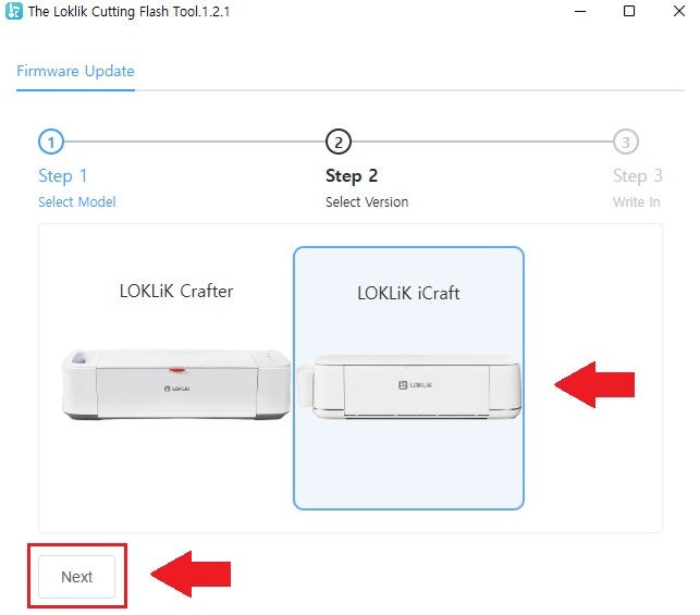 ⑥ 설치가 완료된 "플래시 툴" 프로그램을 실행하여 화면에 "록릭 아이크래프트 LOKLiK iCraft" 기기를 선택하고 "Next"를 클릭해 주세요.