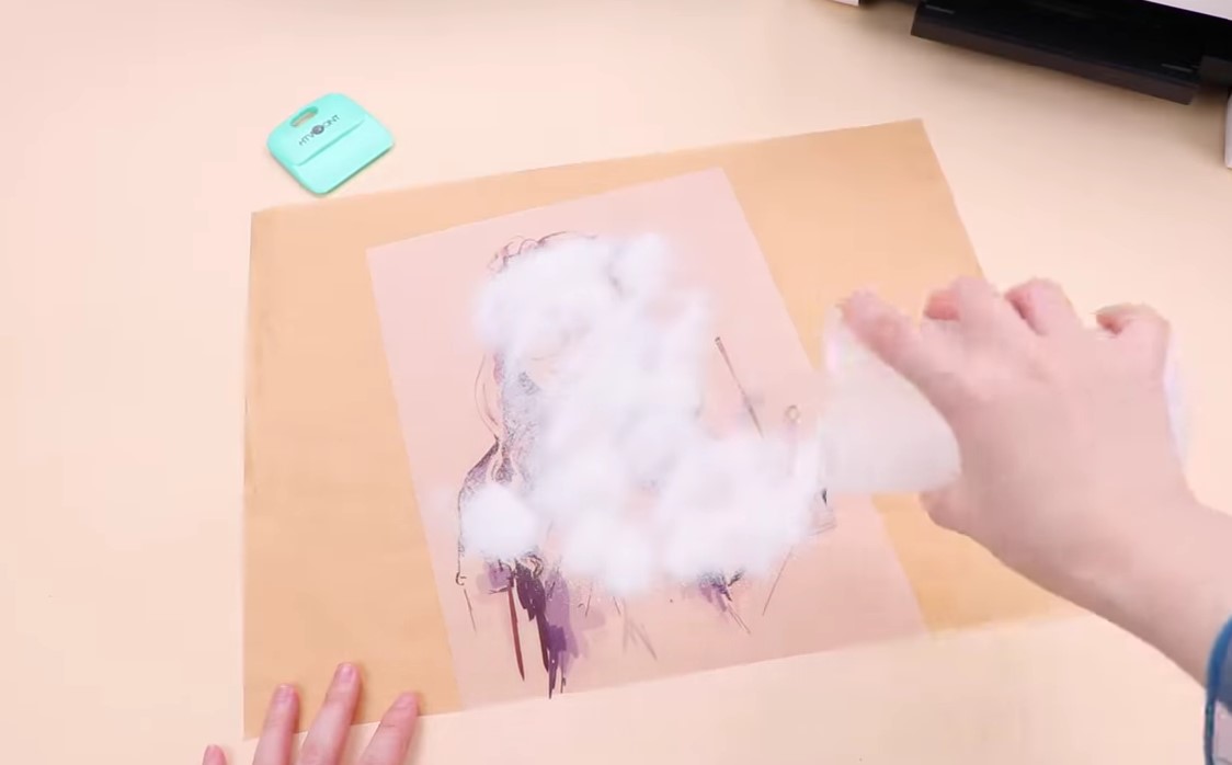 2. 인쇄한 DTF 필름에 핫멜트 파우더를 바른 뒤 여분을 정리